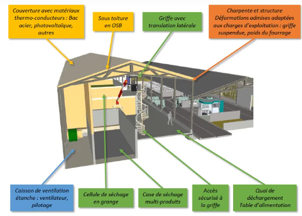 Séchage par ventilation : l’air chaud et sec, soufflé par un ventilateur, traverse le fourrage de bas en haut. Il capte son humidité et le sèche progressivement.