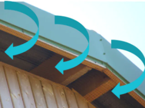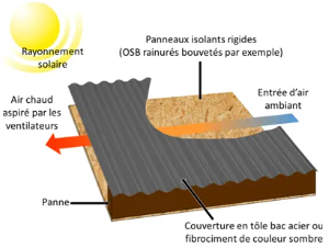 Le rayonnement solaire au contact de la toiture sombre du bâtiment (bac acier couleur ardoise) réchauffe la lame d’air contenu entre le toit et les panneaux isolants rigides.