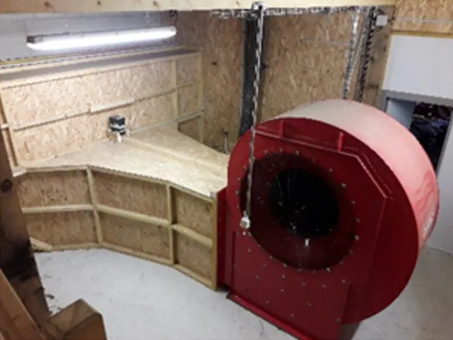 L’air chaud est amené jusqu’au ventilateur par dépression. Il est ensuite refoulé dans la gaine de ventilation qui se trouve à l’intérieur de la cellule de séchage.