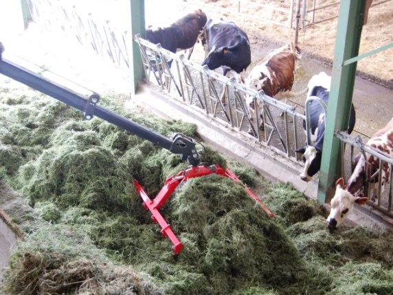 Distribution du foin à l’auge à l’aide de la griffe ou d’une remorque mélangeuse selon la configuration des bâtiments.