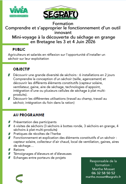 Visite de 6 séchoirs pour découvrir et comprendre la technique de séchage des fourrages (visite de 3 séchoirs bottes rondes et 3 séchoirs en grange avec 3 séchoirs à plat). Formation destinée aux agriculteur.ice.s et salarié.e.s en réflexion sur l'installation d'un séchoir, avec apports techniques et témoignages d'exploitants.